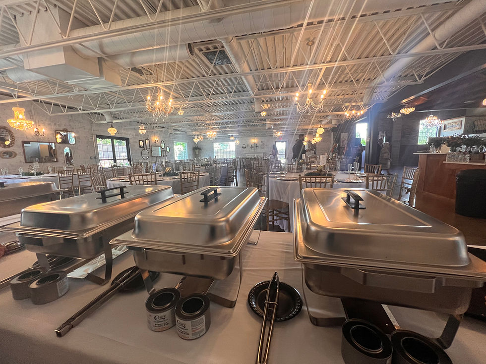 Buffet Supplies: chafers, fuel, servingware, trays, bowls.